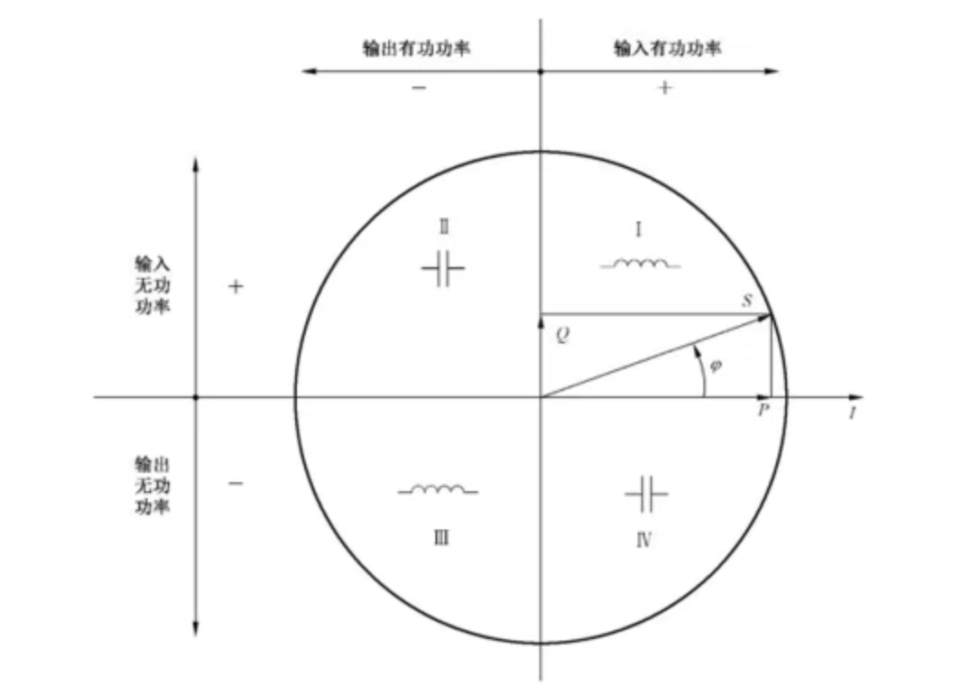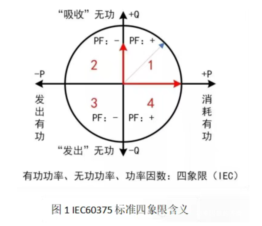 在IEC60375標準中(圖1),功率因數的正負是由有功功率的方向決定的,當處于用電狀態時,有功功率為正,在發電狀態則為負。我們為了在控制器上能更好的體現以及方便客戶直觀的感受,在第三、第四象限時都會在控制器顯示的功率因數前加上“-”來表示功率因數超前;相反在第一象限和第二象限則直接用純數字表示功率因數滯后。